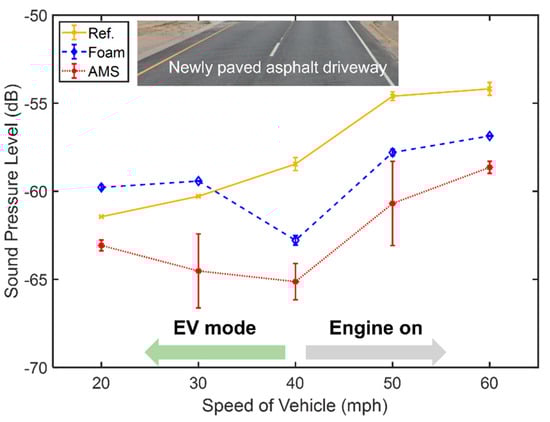 The average sound pressure level in the band 200–300 Hz depends on the vehicle speed, as shown in Figure 7. The noise level increases with the speed, and the slope of noise changes when the mechanical engine kicks on after 40 mph due to the electric to gasoline power modes. Average values are used so that the foam case shows more noise than the reference case. Although the foam reduces the cavity mode’s noise, more peaks occur near the cavity mode, as seen in Figure 6b. The AMS is 1.45 times heavier than the foam. Nevertheless, through all speed ranges, the AMS clearly provides a better noise reduction effect than the foam, 2–5 dB near the cavity mode, at 200–300 Hz.