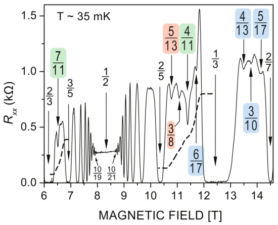 However, not all fractions for FQHE observed experimentally in the LLL of GaAs [30] belong to the hierarchy (3). The series of these additional fractions like (cf. fractions marked in color in Figure 2) correspond to FQHE states frequently referred to as enigmatic. They are out of reach for the conventional CF model, and, moreover, they are assisted with typical for FQHE states plateaus in , but local minima in at these states are nonzero in contrary to zero longitudinal resistivity at states from the hierarchy (3)—cf. Figure 2. Neither the CF model, nor other conventional theories of FQHE, are able to elucidate this latter behavior.