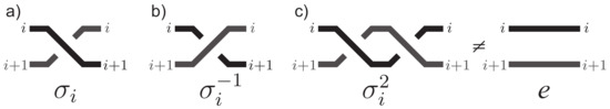 (a) Conventional geometric presentation for the generator of the full braid group [34,35]—this generator describes the transposition of a particle i-th with -th one on the plane when other particles remain on their positions. (b) Inverse braid . (c) Square of generator , which for is not a neutral element of the group (though for , and this is a reason for the simplicity of the braid group in 3D in comparison to 2D case).