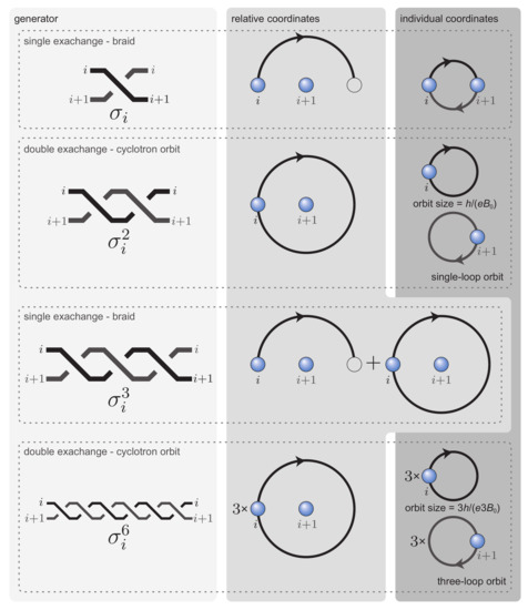 Schematic illustration that the elementary braids in the full group on the plane (the Artin group [34,35]), , and in its cyclotron subgroups, (in the figure for ), must be half-pieces of cyclotron orbits. The illustration is shown in individual coordinates of particle pairs on the plane and in relative coordinates, both for the generators—braids and for the cyclotron orbits—square of braids (cyclotron braids are half-pieces of cyclotron orbits).