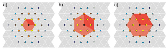 Triangle Wigner 2D lattice of repulsing electrons on a positive jellium at K with hexagonal Bravais elementary cell and indicated nearest neighbors (a) and two types of next-nearest ones (b,c). The hexagonal structure of sublattices of next-nearest neighbors is conserved.