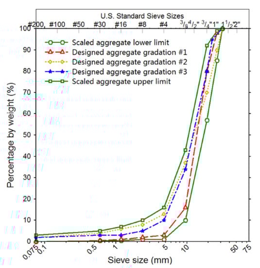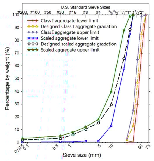 where , , and are the maximum grain size, the minimum grain size, and the specific grain size, respectively; superscripts b and m denote original and scaled ballast gradations, respectively; and A is a constant. Based on the maximum and minimum grain sizes of original and scaled aggregate gradations, the constant A was calculated using Equation (2).