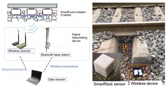 Illustration of the SmartRock (SR) sensing system (left) used in railroad track applications (right).
