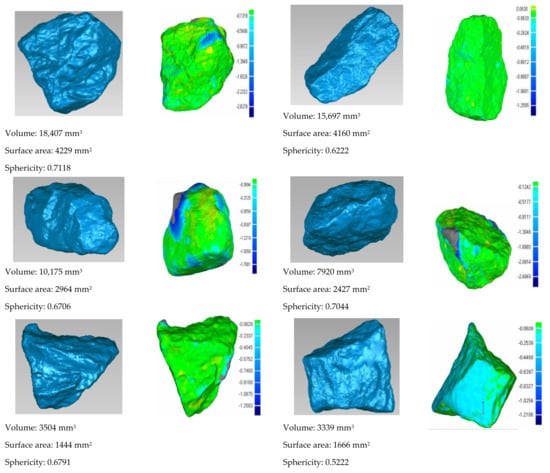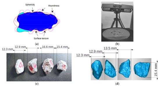 where Pc denotes the perimeter of the circle having the same projected area as the particle, Ps denotes the perimeter of the particle, Vx denotes the volume of the convex hull of the particle, and Vi denotes the volume of the largest inscribed sphere of the particle. To demonstrate and quantify the variation of particle morphology during gyratory compaction, a selection of coarse particles (retained on No. 4 or 4.75 mm sieve) were sampled from gyratory specimens prepared with scaled gradations. Then, those selected coarse particles (of which examples are shown in Figure 6c) were all digitalized for 3D shape (see Figure 6d) by the aforementioned laser scanner both before and after gyratory compaction.