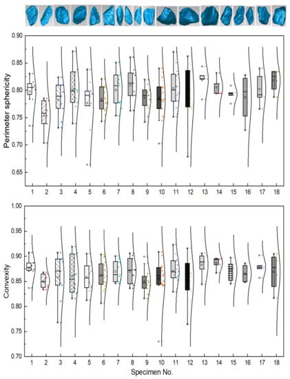 In this study, in order to minimize the effect of shape variation of coarse particles on compaction behavior, and thus reduce the potential total number of gyratory specimens required (if particle shape were introduced as an additional variable), the shape parameters of coarse aggregate particles of all the gyratory specimens were properly controlled at a similar level. As evident from Figure 7, the average values of perimeter sphericity of the selected particles from the 18 specimens range from 0.76 to 0.81, indicating that the perimeter sphericity of the particles of the 18 specimens is quite similar. The average convexity values of selected particles from the 18 specimens range from 0.85 to 0.88. It is quite obvious that the difference in convexity values of the 18 specimens is smaller than that in perimeter sphericity values. Therefore, the particles sampled from the 18 specimens possess similar geometry, and the effect of morphology variation of coarse particles on compaction behavior can be ignored.