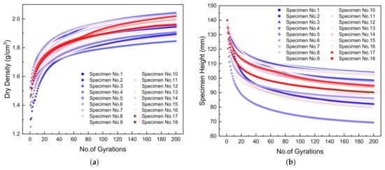 The gyratory compactor adopted in this study is commonly used for compacting hot mix asphalt, as illustrated in Figure 3. It has the following main technical specifications: calibrated internal angle of 1.16° and rotational speed of 30 rpm. The diameter of the specimen is 150 mm. The real-time height data of gyratory specimens were recorded directly by the built-in data acquisition system of the gyratory compactor. Despite that there are currently no standardized test procedures for compacting soil with a gyratory compactor, four major variables are regarded influential for gyratory compaction quality, i.e., gyration angle, gyrations, vertical pressure, and gyration rate. Previous SHRP work by Cominsky et al. [] indicated that little variation was obtained through different rates of rotation and this seemed to be applicable at any angle. The gyratory angle was previously found to affect soil compaction, and the void ratio of soil specimens became more stable when the angle was between 1.0 and 2.0 degrees []. Therefore, in this study, the gyratory angle and gyration rate were fixed at 1.16° and 30 rpm for all the specimens tested, respectively, while three different levels of vertical pressure were adopted. The complete record of specimen height and dry density change with the number of gyrations was obtained for each specimen during the gyratory compaction process.