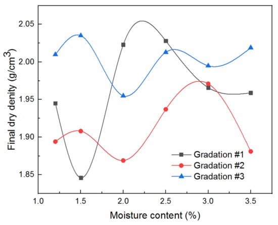 Moisture–density curves obtained from gyratory compaction tests for three different gradations.