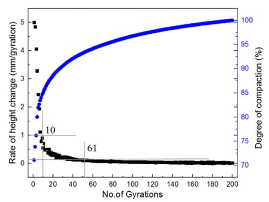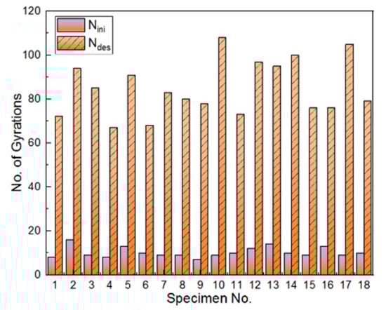 Zhang et al. [] divided the entire compaction process into three stages by three threshold points corresponding to the initial number (Nini), the design number (Ndes), and the final number of gyrations, respectively. The rate of height change greater than 1 mm per gyration can be regarded as the first stage, 0.1 to 1 mm per gyration as the second stage, and 0 to 0.1 mm per gyration as the final stable stage. The second stage ranges between the initial number and the design number of gyrations, whereas the final stage ranges between the design number and the final number of gyrations. To take an example, the rate of height change and the degree of compaction of the specimen compacted with the optimal combination of gyratory parameters were calculated and plotted against the number of gyrations in Figure 10. It can be seen that the initial self-compaction stage is from 0 to 10 gyrations, the intermediate gyratory compaction stage is from 10 to 61 gyrations, and the final stable stage is from 61 to 200 gyrations. The two threshold points (Nini and Ndes) for all the specimens in the orthogonal array matrix are shown in Figure 11. The maximum difference of Nini values of 18 specimens is 12, whereas the maximum difference of Ndes values is 46. Therefore, it can be inferred that the Nini values are relatively close among different specimens; however, the Ndes values show somewhat considerable variations. This infers that physical properties and compaction parameters of unbound permeable aggregates significantly affect the second stage of gyratory compaction and corresponding compaction quality.