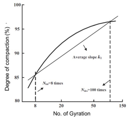 As illustrated in Figure 12, the curve of the degree of compaction versus the number of gyrations, which is displayed on a semi-logarithmic plot, can be used to define the average slope K1 using Equation (6) []. The parameter K1 can then be used to assess the compaction state, with a higher K1 value indicating better compaction quality.