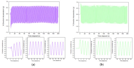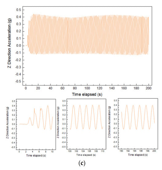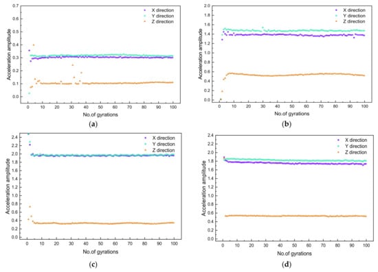 Acceleration results measured in three different directions of at the middle center of the specimen with optimal combination of gyratory parameters: (a) X direction, (b) Y direction, and (c) Z direction.