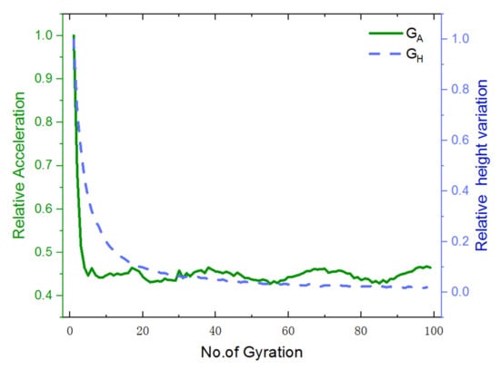 In order to further analyze the relationship between particle acceleration and compaction characteristics, the relative height variation %H and the relative acceleration %A, which are calculated from Equation (8) and Equation (9), respectively, are plotted against the number of gyrations in Figure 16. It can be seen that both %H and %A curves descend drastically during the initial cycles of gyratory compaction and then gradually become stable.