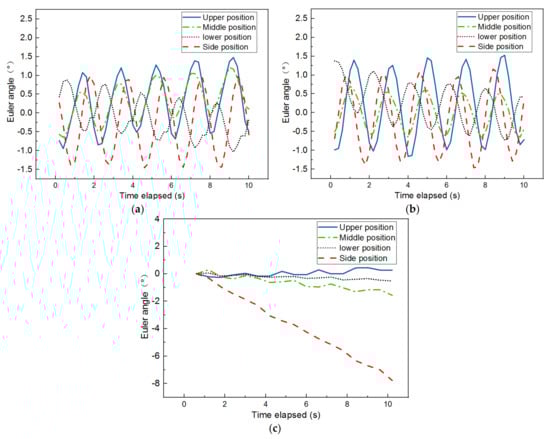 Euler angle results measured at four different positions of the specimen with optimal combination of gyratory parameters: (a) X direction, (b) Y direction, and (c) Z direction.