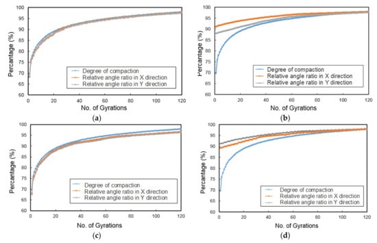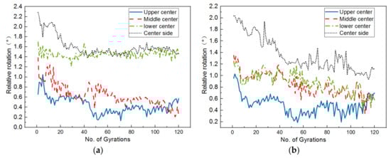 During the course of gyratory compaction, meso-scale particle movement mainly includes translation and rotation. The translation of particles is shown as the decrease in specimen height, while the rotation of particles reflects the inter-particle contact and interlocking. In this study, the rotation of particles is quantified and analyzed as the relative rotation. As expressed in Equation (10), the relative rotation in each of the three dimensions is defined as the difference between the maximum and minimum values of the Euler angle within each cycle. The results of such relative rotation values are plotted against gyration cycles in Figure 16. Note that the so-defined relative rotation measures maximum movement angle of particles within each cycle in X, Y, and Z directions, respectively.