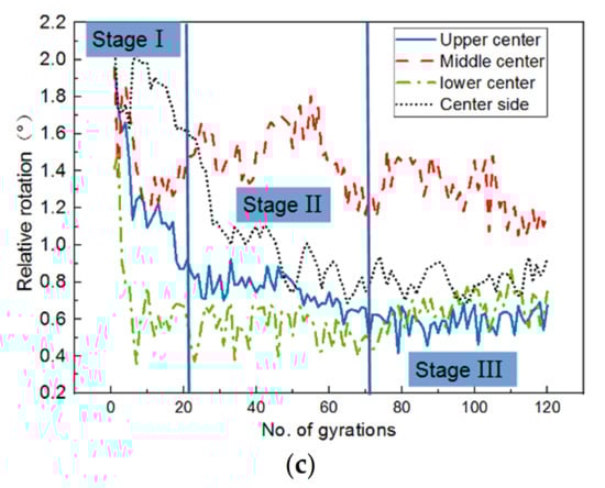From Figure 18, it can be seen that most of the curves of relative rotation versus gyration cycles exhibit a sharp reduction during the initial stage and then gradually become stable during the subsequent stage. Hence, such curves can be divided into the aforementioned three distinct stages, i.e., the self-compaction stage (or stage I), the transition stage (or stage II), and the stable stage (or stage III), as illustrated in Figure 18c. The three stages of particle rotation are similar to those of specimen height or achieved dry density. Obviously, smaller and more stable relative rotation values of coarse particles tend to indicate stronger inter-particle contact and interlocking, and thus less potential of further densification. This further supports the innovative and rational use of meso-scale particle movement to characterize the gyratory compaction process and control compaction quality. Note that the maximum relative rotation values recorded at those four different positions appear to occur in different directions, which suggests the position-dependent feature of particle rotation. The curves of relative rotation versus gyration cycles corresponding to the upper center and center side positions exhibit the three distinct stages much more clearly; therefore, the potential use of relative rotation response at these two positions as a meso-scale indicator of gyration compaction quality is supported.