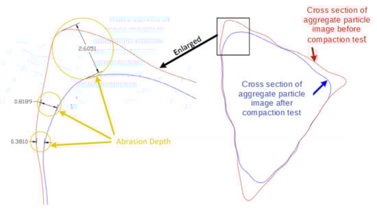 The particle abrasion and breakage are also some of the important aspects of compaction characteristics that deserve assessment and investigation, particularly for unbound permeable aggregates. Few studies have quantified particle abrasion and breakage during compaction, partly owing to the lack of proper techniques. With the advent of 3D laser scanning, it becomes possible to accurately digitize coarse particles with a 3D irregular shape. In this study, a selection of coarse particles retained on a No. 4 or 4.75 mm sieve were randomly picked, marked, and then digitized via the 3D laser scanner before and after gyratory compaction for each of the 18 specimens included in the orthogonal array testing matrix. The goal was to quantify particle shape variation caused by compaction. As shown in Figure 20, the abrasion depth of one point on the aggregate surface is defined and calculated as the distance between aggregate particle outlines before and after gyratory compaction that corresponds to this point. Among those different abrasion depth values, the maximum one is defined as the maximum abrasion depth to quantify the degree of abrasion experienced by each particle. The calculated abrasion depth values of selected aggregate particles were color-coded as contour plots and are shown in Figure 21. It can be seen from Figure 21 that the corners and ridges of such particles are more prone to abrasion, as indicated by the darker colors.