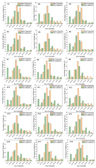 Histograms of particle size distributions before and after gyratory compaction for the eighteen specimens included in the orthogonal array testing matrix.