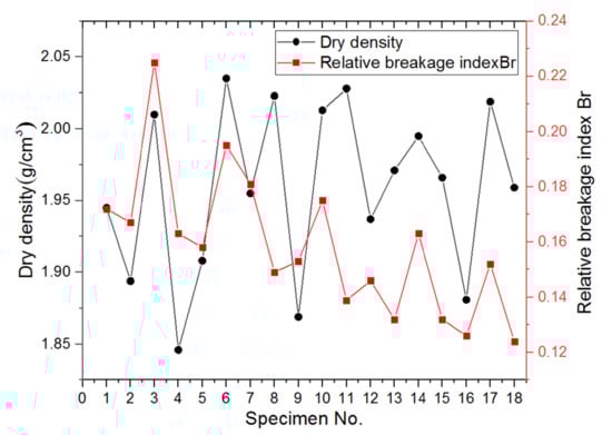 The relative breakage index Br versus final achieved dry density for 18 gyratory specimens included in the orthogonal array testing matrix.
