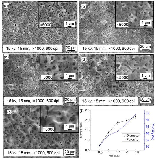 Surface morphologies of MAO coating with different NaF concentrations: (a) 0.5 g/L; (b) 1 g/L; (c) 1.5 g/L; (d) 2 g/L; (e) 2.5 g/L. (f) The curve of the diameter of pores and porosity vs. MAO coating with different NaF concentrations.