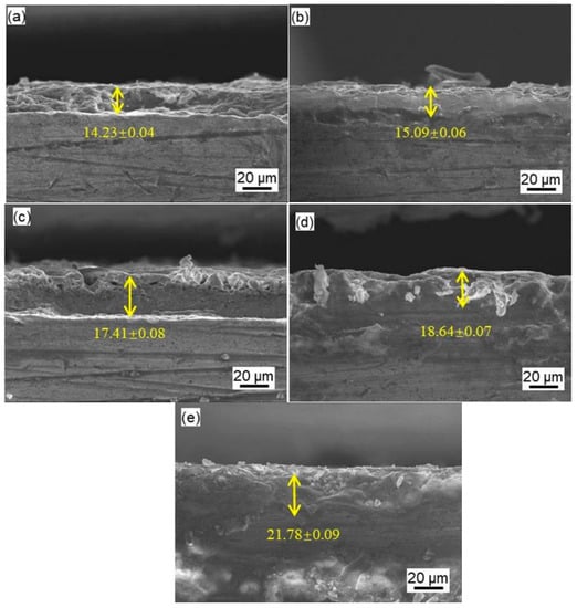 The coating thickness was measured by a scanning electron microscope. Cross-section microstructures of the MAO coatings are shown in Figure 2. The coating thickness clearly increases when the NaF concentration increases. It is obvious that the average coating thickness augments with NaF contents in the silicate-based solutions from 14.23 ± 0.04 μm after NaF concentrations of 0.5 g/L to 21.78 ± 0.09 μm and after a NaF concentration of 2.5 g/L. Therefore, the NaF concentration has a large effect on the thickness of the MAO coating with the same MAO process.
