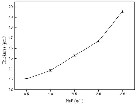 - With an increase in the NaF concentration in the silicate-based solutions from 0.5 g/L to 2.5 g/L, the average thickness increases from 13.05 μm to 19.6 μm.