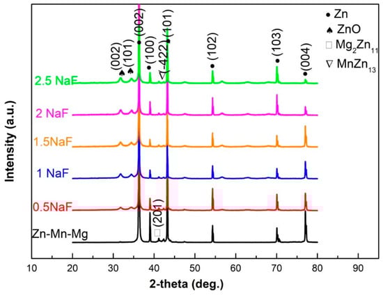 In order to investigate the phases of the MAO coating, XRD tests were carried out. XRD patterns of the Zn-Mn-Mg alloy with and without MAO treatment with different NaF contents are shown in Figure 4. The results show that the Zn-Mn-Mg alloys mainly contain Zn, Mg2Zn11, and MnZn13 phases. After the MAO process treatment, the ZnO phase formed. With an increase in the NaF concentration, the intensity of ZnO gradually increases. The formation of the ZnO phase during the MAO treatment process may be determined by the following reaction: