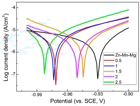 Recently, Zinc (Zn) and Zn alloys have been extensively used in biomedical fields, such as cardiovascular stents, bone implants, wound healing equipment, and orthopedic fixation devices [,]. This is because of their superior properties of formability and suitable biocompatibility [,]. Moreover, Zn can promote bone growth and mineralization, and effectively inhibit the absorption of osteoclasts []. However, Zn alloys have several obvious disadvantages [,]. For example, considering the recovery process of damaged tissue, the corrosion rate of Zn alloys was relatively slow []. So far, Yang has implanted pure zinc stents into the abdominal aorta of Japanese rabbits for a more than perfect degradation period []. Therefore, it is urgent to speed up the corrosion rate of Zn alloys.
