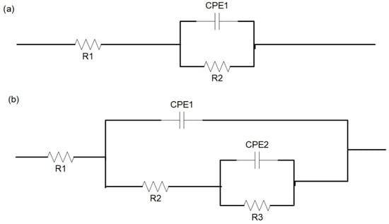 Figure 7 shows the equivalent circuits of Zn-Mn-Mg alloys and MAO modified with different NaF concentrations in the silicate-based solutions for the alloys. Capacitance in the equivalent circuit indicates that there is an oxide barrier formed by air on the exposed Zn-Mn-Mg alloys (Figure 7a), whereas the equivalent circuit with two capacitances means a double-layer coating composed of MAO coatings (Figure 7b). R2 and CPE1 represent the resistance and capacitance of the oxide barrier layer, respectively; R3 and CPE2 correspond to the resistance and capacitance of the MAO layer, respectively; R1 is the resistance of the electrolyte between the working electrode and the reference electrode. CPE is calculated by Equation (2), where ZCPE is the CPE impedance (Ω cm2), j is the imaginary number, and ω is the angular frequency [].