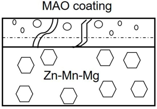 MAO technology can obtain a high degree of combination with alloys, and effectively improve the surface morphologies of Zn-Mn-Mg alloys. A bilayer structure is composed of an outer porous layer and an incoherent dense inner layer, which was formed after MAO treatment on the surface of Zn-Mn-Mg alloys (Figure 8) []. According to the oxidation law, the growth process of MAO coating on Zn-Mn-Mg alloys can be classified into different periods. First, a thin oxide coating (barrier layer) is formed on the outside at a low anode voltage without sparking at this stage [,]. When the voltage increases and crosses the breakdown voltage threshold, the loss of dielectric stability leads to the formation of discharge passages in the low dielectric region []. As a result, many micro sparks are produced in the thinner or weaker speckles and move rapidly to the oxide film [,]. Although the period of each spark is very short, the anode film can be formed in the discharge channel and the substrate can be melted [,]. When the melt is cooled in the electrolyte, part of the melt spurts along the discharge channel, and the deposit of the molten product on the wall of the discharge channel []. In this way, the coating thickness increases, and a porous structure is established. When the voltage exceeds the breakdown potential, an inner layer is formed at the initial stage of the spark [,]. The inner layer is loosened with many flaws and holes distributed over the cross surface. Therefore, it is hypothesized that these faults in the anodic coatings occur in low voltage and lead to the inner structure that is formed at the initial spark discharge stage in the case of high gas release and micro-arc discharge. With the formation of a large number of bubbles on the surface of the metal sample, the metallic luster of the substrate gradually disappears, and a very thin oxide coating is formed [,].