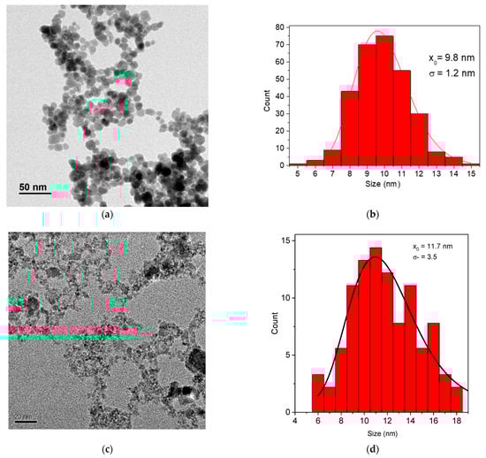 TEM image (a) and size distribution (b) of γ-Fe2O3 NPs and TEM image (c) and size distribution (d) of MnFe2O4 NPs. (Figure 1c,d reprinted with permission from ref. []. Copyright 2016 Elsevier).