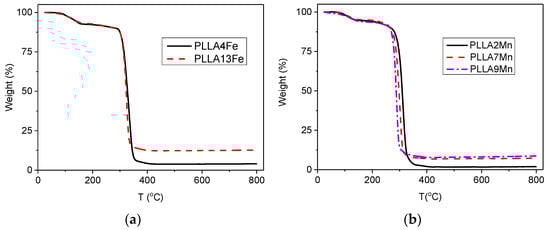TG thermograms of (a) PLLA/γ-Fe2O3 and (b) PLLA/MnFe2O3 composites.