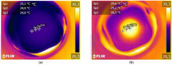 Infrared thermal image of PLLA13Fe composite sample before (a) and during (b) EM field treatment with 331 kHz and 10.1 kAm−1.