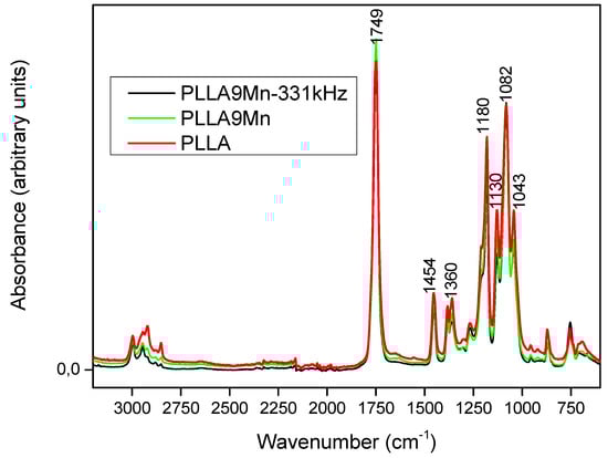The chemical structure of PLLA with different MNP concentrations was studied by FTIR. Figure 5 shows the FTIR spectra of PLLA, PLLA9Mn, and PLLA9Mn treated with 331 kHz electromagnetic fields, with emphasis on the hydroxyl (-OH), methyl (C-H), and carbonyl (C=O) region. The most representative absorption bands of PLLA functional groups appear in the range of 800 to 1800 cm−1 for unsaturated groups, 1680 to 1800 cm−1 for the carbonyl group, and 2900 to 3000 cm−1 for CH2 and CH3 groups (Table S1).