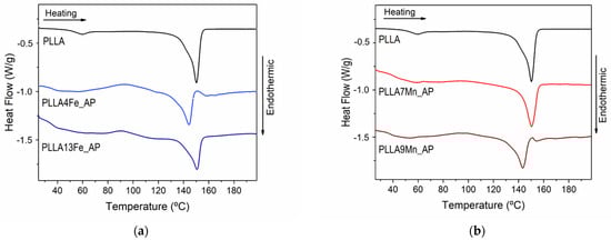 As can be appreciated, the addition of MNPs reduces the cold crystallization temperature (Tcc) and the glass transition temperature (Tg) of the matrix. However, this latter effect is difficult to affirm soundly because the trapped chloroform has a plasticization effect that is revealed at the same temperature range (below 60 °C). Likewise, the presence of MNPs inhibits the PLLA crystallization, as can be inferred from the crystalline fraction data (see Table 4). In the PLLA4Fe_AP and PLLA9Mn_AP samples, two endothermic peaks corresponding to two melting temperatures appear, suggesting that the two crystalline phases nucleated. This finding can be attributed to two different crystallite size distributions, where the smaller ones have lower Tm, or even to the presence of the less ordered α’ form together with the more ordered α form, which is the more common and stable form when PLA is obtained under conventional solution crystallization conditions. The first melting peak has been attributed to the simultaneous melting of the present α’ crystal form together with the recrystallization of the α’ into α crystal form, while during the higher temperature peak, the melting of the latter α crystal form developed during the recrystallization process takes place [].