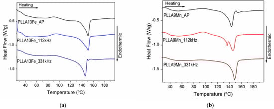 DSC scans of composites before and after EMF treatments at 112 and 331 KHz: (a) PLLA reinforced with 12.7 wt% of γ-Fe2O3 MNPs and (b) PLLA reinforced with 8.7 wt% of MnFe2O3 MNPs.