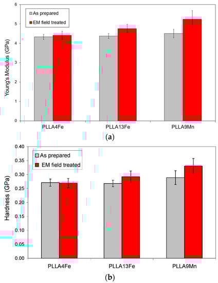 The hardness and modulus average values of PLLA4Fe, PLLA13Fe, and PLLA9Mn composites before and after EM field treatments are presented in Figure 8. Indentations localized on the MNPs clusters were not considered.