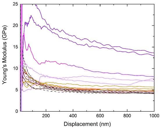 The curves with higher Young’s modulus correspond to micrometric clusters of nanoparticles (purple color). The modulus values of these areas were higher than 10 GPa in the range of 500–1000 nm. The indentations made on zones with smaller aggregated MNPs show modulus values intermediate between the matrix and micrometric cluster (pink line) within the range of 6–10 GPa. Both regions with aggregate MNPs were not considered for the determination of the modulus and hardness average values, as shown in Figure 2.