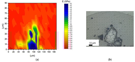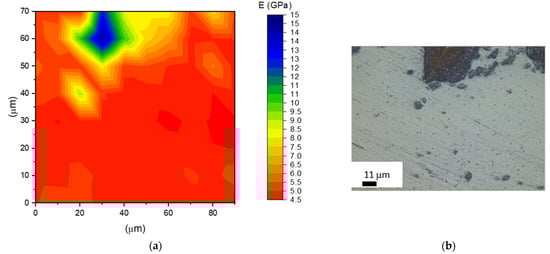 Figure 10 and Figure 11 represent the nanomodulus distribution in PLLA9Mn composites in the as-prepared state and after EM field treatment, as shown in the contour map (a) and the optic microscope (OM) picture (b). A comparison of both contour maps shows the variations of stiffness around the clusters for the EM field-treated sample in the zones of PLLA without heterogeneities. Stiffer areas can be observed in accordance with the stabilization of crystalline regions associated with MNPs’ heating effect.