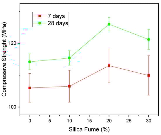 Chen et al. (2018) [116] studied the application of fly ash to replace OPC in percentages of 0–30% for the production of UHPC by molding in an autoclave, with an application of pressure in the production stage of the specimens. The authors observed that the use of 20% ash allowed to obtain a compressive strength at 28 days of 125 MPa, while the reference composition presented a strength of 105 MPa at the same age, as shown in Figure 2. This change in strength was attributed by the authors to the greater formation of C-S-H, which is directly attributed to the pozzolanic reaction promoted by the material, as well as to the likely improvement in granular packing, related to the physical effect. In addition to the aforementioned research, several other studies used silica fume as a mineral addition [68,117,118,119,120,121].