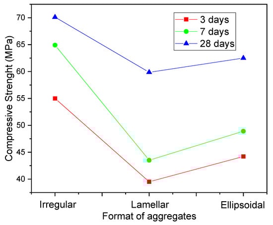 On the D/d ratio, Zhao et al. (2021) [153] evaluated the influence of three coarse aggregate geometry on the mechanical properties of HPC. The authors used lamellar, irregular, and rounded aggregates. The strength results obtained by the authors are highlighted in Figure 3, where it is possible to observe that the best results are obtained with irregular aggregates. This is attributed by the authors to greater adherence between the cementitious paste phases and the aggregates, which improves the behavior of HPC.