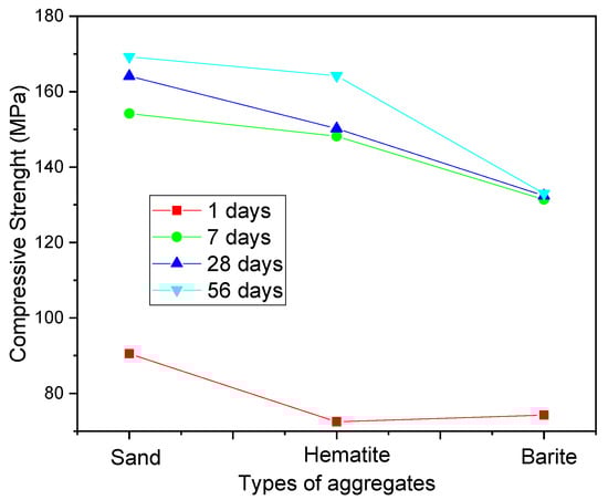 There are also researches using heavy aggregates such as barite, magnetite, and hematite for HPC in nuclear protection applications [147,160,161]. Figure 4, for example, shows the compressive strength results obtained using 3 types of fine aggregate: silica sand (97.32% SiO2), barite (58.69% BaO), and hematite (71.71% Fe2O3). The silica sand used has a specific mass of 2.7 g/cm3, while the barite has 3.0 to 4.4 g/cm3. Although the compressive strength results are better for the composition with silica sand, the radiation absorption values of cobalt and cesium were much higher for heavy concrete manufactured with barite, justifying its use in this type of application.