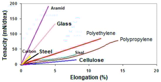 The reinforcement phase of a composite can be in the form of filler particles or in the form of fibers. In the case of HPC and UHPC discussed in this section, the reinforcement phase is composed of synthetic fibers that can be metallic, polymeric, and ceramic, or natural fibers, of mineral, animal, and vegetable origin [12,13,190]. Figure 5 shows the behavior of tenacity and elongation at the break of the main fibers used for application in HPC and UHPC, while Table 5 shows the main properties of these fibers. The main advantages of applying fibers in HPC and UHPC are the high gain in mechanical strength, both in compression and in traction, and the increase in ductility. Disadvantages include the reduction in the workability of concrete, which can be solved using 3rd generation of superplasticizer reducers, and the higher cost of the material, especially with the use of synthetic fibers. These issues will be detailed in this section.