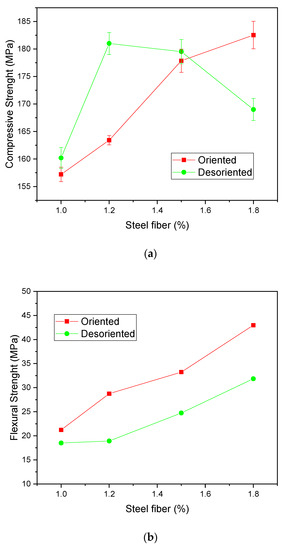 On the mechanical properties obtained by the application of steel fibers, Gou et al. (2021) [206], studied the mechanical properties of HPC containing different fractions of steel fibers in an orderly and disorderly manner in the cementitious matrix. The authors observed, as can be seen in Figure 6a, that the use of 1.0, 1.2, and 1.5% of disordered fibers presents compressive strength after 28 days of cure, superior to equivalent compositions with oriented fibers. However, this pattern of behavior is changed with the use of 1.8% of fibers because, as the fiber content is high, the workability of the cement mortar reduces, resulting in an agglomerate of steel fibers, which causes the formation of inter-defects in the concrete and, consequently, the loss of strength.
