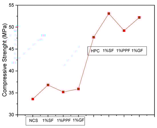 Zhang et al. (2020) [106] studied the effects of replacing 25% OPC by fly ash (50.35% SiO2, 29.65% Al2O3, 6.61% Fe2O3, 5.85% CaO) in HPC subjected to situations of high temperatures. The authors obtained a compressive strength at 28 days of approximately 55 MPa for the composition containing ash, while the reference composition showed a strength of less than 50 MPa, not being characterized as HPC. At all ages evaluated, the compositions containing fly ash showed a better mechanical performance, which is directly related to the pozzolanic effect.