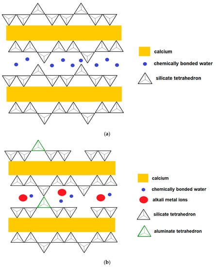 Mineral additions can be classified according to their reaction with the clinker as inert. This, in general, only contributes to a physical filling effect improving the packaging. For example, this happens with the application of limestone filler as well as in cement, such as blast furnace slag, and in pozzolanic products, such as metakaolin, fly ash, agro-industrial ash, and silica fume [85,88,89]. Cementing additions are materials, usually based on calcium, that present an accelerated reaction capacity in the presence of alkaline media, as is the case of Ca(OH)2 of portlandite present in OPC [90,91]. They can also be activated with the use of other alkaline hydroxides, such as NaOH and KOH, through alkaline activation, dispensing in this case, the presence of OPC [92,93]. This type of reaction will be described in Section 4.