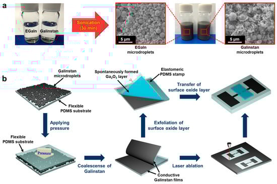 Recently, liquid metals based on gallium (Ga) alloys have received increasing attention, owing to their outstanding electrical and mechanical properties [1,2,3]. The Ga-based metal alloys that exist as virtually non-toxic liquids at room temperature show not only excellent stretchability and deformability but also environmental friendliness and recyclability. In this context, extensive research efforts have been devoted to the development of various applications using Ga-based metal alloys, such as sensors [4], reconfigurable antennas [5], and soft electrodes [6]. These fluidic metal alloys also show great potential for electronic skins [7,8] and wearable electronics [9,10,11]. Among various Ga-based metal alloys, Galinstan (68.5% Ga, 21.5% indium (In), and 10% tin (Sn)) has been notably studied in recent years due to its remarkably low toxicity and melting point (~−19 °C) [12], which is also suitable for flexible and stretchable devices operating below 0 °C compared to other eutectic gallium indium (EGaIn).