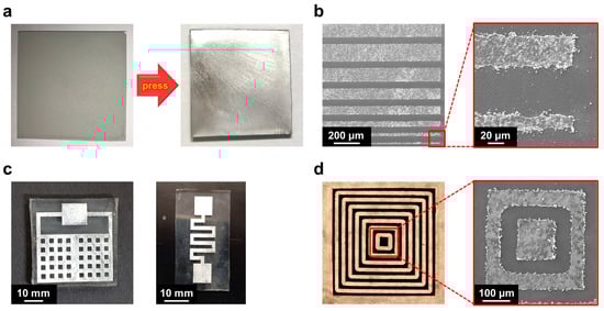 Although Galinstan shows outstanding properties including flexibility and stretchability even under cold conditions, its high surface tension and rapid oxidation rate hinder the fabrication of desirable patterns for electronic devices and circuits in comparison with other functional materials [13,14,15]. Various methods for Galinstan patterning thus have been developed and enhanced, including microfluidic injection [16,17,18,19,20,21], photolithography [22,23], stencil lithography [24,25,26,27], imprint lithography [28], microcontact printing [29,30], and composite material synthesis [31]. Each of these methods has individual advantages (i.e., high processability, high resolution limits, high stability, or cost-effective fabrication); however, integrating all the advantageous elements is still a challenge. For instance, the demanding process conditions for delaying surface oxidation or preventing leakage of the liquid metal or the low patterning resolution limits still need to be improved depending on the method. Laser ablation is one of the patterning methods with high processability, enabling the rapid fabrication of electrodes with complex features [32,33]. Although the pattern resolution is limited by the beam spot of laser, which is normally in the range of tens to hundreds of micrometers, this method can be directly employed for various applications without laborious pre- and/or post-treatments.