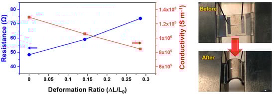 The electrical resistance and conductivity of the Galinstan film were measured corresponding to the structural deformation of the PDMS substrate. For the measurements of electrical properties, the patterned Galinstan electrode (80 μm 5 mm) was used as shown in Figure 3. Its thickness was less than 1 μm. The electrical resistance and conductivity were initially measured as 48.3 Ω and ~1.3 106 S m−1, respectively. In response to the deformation ratio, the electrical resistance gradually increased to 73.8 Ω, corresponding to an electrical conductivity of ~8.5 105 S m−1. In comparison with pure Galinstan, in which the electrical conductivity was found to be ~3.5 × 106 S m−1, the relatively low electrical conductivity of the Galinstan films used in this work could be attributed to the partial cracks and insulating components remaining in the films, such as (GaO)OH and Ga2O3. However, since the majority of the film components were Galinstan, the fabricated films still possessed electrical conductivity high enough to be used as flexible electrodes. It should be noted that the electrical conductivity of the fabricated Galinstan film (~1.3 106 S m−1) is slightly lower than that of the thin EGaIn film (~2.2 106 S m−1) prepared using the same procedure [39]. It is possibly originating from the content of the insulating material in the suspension. As shown in Figure 1a, the content of the rod-shaped particles in the Galinstan suspension is significantly higher than in the EGaIn suspension under our experimental conditions, which may cause a decrease in overall electrical conductivity.