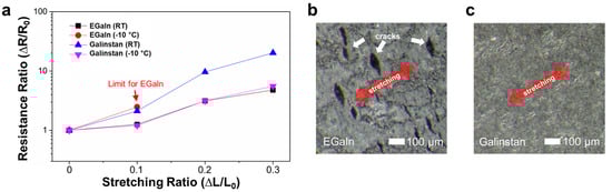One advantageous property of Galinstan is the liquid phase, maintaining its flexibility and stretchability, even below 0 °C. To compare with EGaIn, electrical resistances of the two materials were measured corresponding to lateral stretching (up to ~130%) of the PDMS substrates. For the measurements, the flat Galinstan and EGaIn electrodes were individually prepared on the PDMS substrates (15 × 25 × 1 mm3) and then stretched up to 130% at room temperature and −10 °C, respectively. Changes in the electrical resistances upon lateral stretching are shown in Figure 4a. At room temperature, the electrical resistances of both materials slightly increased with the stretching ratios, which is possibly originating from structural deformation [26]. At the temperature of −10 °C, the cracks were generated inside the EGaIn film upon the lateral stretches (see Figure 4b), leading to significant reduction in the film continuity. When the stretching ratio was above 110%, the electrical conductivity of the EGaIn film was thus not observed. However, differently from EGaIn, the Galinstan film was still electrically conductive even if the stretching ratio increased up to 130%. These results were caused by the difference in the melting points of the two materials (i.e., ~−19 °C for Galinstan and ~16 °C for EGaIn). At −10 °C, the EGaIn film in the solid phase was significantly damaged, whereas the Galinstan film in the liquid phase showed excellent film continuity (see Figure 4c).