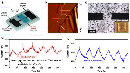 To investigate the solar-blind photodetective properties of the exfoliated Ga2O3 film in consideration of its wide bandgap (~4.9 eV) [35,36,37,38], a channel between two patterned Galinstan electrodes was bridged using Ga2O3, as shown in Figure 5a. For this work, the conductive Galinstan film, prepared on a large area (50 mm 50 mm), was patterned by laser ablation to form a channel. The transparent Ga2O3 film, individually prepared on the PDMS stamp, was placed between the channel to complete the device structure (see Figure 5b). The output current was constantly measured at a sample bias voltage of 0.1 V. Under visible light irradiation with a halogen lamp (ranging from 350 to 900 nm), the output current only increased by ~2.7% at a high light intensity of 30 mW cm−2 (see Figure 5c), and no significant change in the output current was observed at lower light intensities. As the contribution of the short-wavelength region in the emission spectrum is not negligible at high intensity, a small increase in the output current could be detected at light intensities above 30 mW cm−2. To confirm this speculation, the output current was also measured under irradiation of UV light of a 365 nm wavelength, which was contained in the emission spectrum of the halogen lamp, and the output current in effect increased by ~14.9% at a low light intensity of 0.2 mW cm−2. Eventually, under deep UV irradiation (254 nm wavelength) with an extremely low light intensity of 0.1 mW cm−2, the output current sensitively increased by up to 15.1% (see Figure 5d). These results strongly suggest that the combination of Galinstan and its surface oxide layers can be used for sensitive solar-blind photodetectors that possess remarkable advantages, such as low-cost and easy processability under ambient conditions, and flexibility.