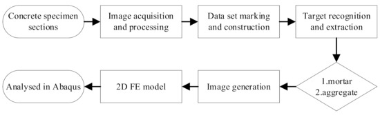 The actual aggregates images of concrete were obtained by digital image processing [31,32,33], with which 2D FE models were established. The Digital image processing (DIP) procedure is shown in Figure 3.